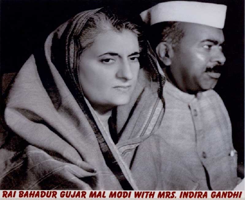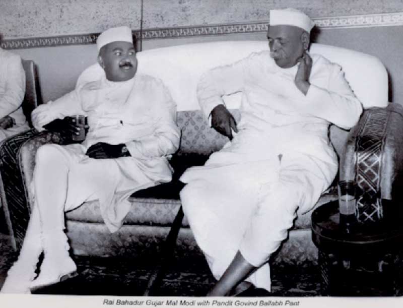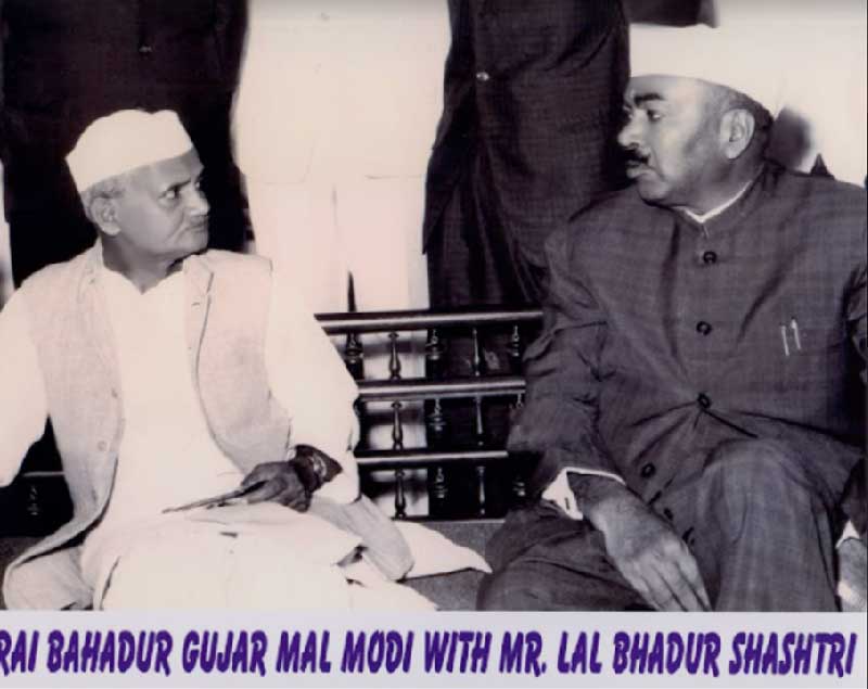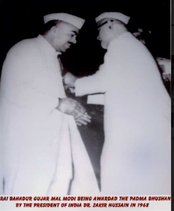 Rai Bahadur Gujarmal Modi was deeply committed to industry, social service and education which lead him to play a pivotal role in nation building along with India's leadership starting from Prime Minister Pandit Jawaharlal Nehru, Lal Bahadur Shastri, Indira Gandhi, Moraji Desai to Pandit Govind Ballabh Pant. He was conferred the Padma Bhushan by the President of India Dr. Zakir Hussain In recognition of his contributions towards India's industrial growth and public welfare.